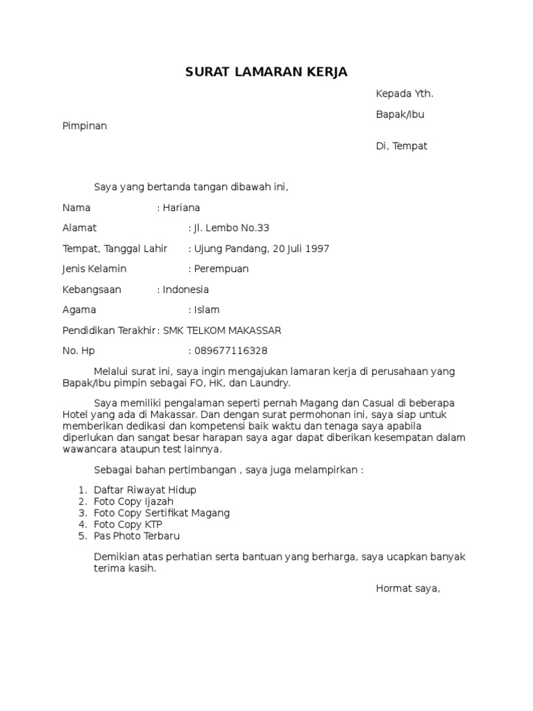 Lamaran Kerja from imgv2-1-f.scribdassets.com Pada pembahasan sebelumnya, kita telah membahas contoh surat pengunduran diri yang bagus dan halus. Salah satu syarat yang diwajibkan perusahaan atau pemberi kerja adalah surat lamaran kerja. Contoh surat lamaran ini diawali salam pembuka, maka tentulah harus diakhiri dengan salam penutup. 9 contoh surat penawaran untuk mempromosikan produk jasa anda. Nanti kita akan berikan contoh surat lamaran kerja di hotel berupa file.doc atau salah satu aplikasi andalan kita yaitu microsoft word. Hotel menyediakan banyak lowongan pekerjaan bagi masyarakat terlebih lagi bagi mereka yang memang mengambil program pendidikan kehotelan. Dalam pembuatan surat lamaran kerja di pt anda harus menulis posisi yang sesuai dengan yang dibutuhkan pt tersebut. Nah jika anda berniat menjadi karyawan buktikan kepada pemilik usaha ini agar bangga kepada anda.